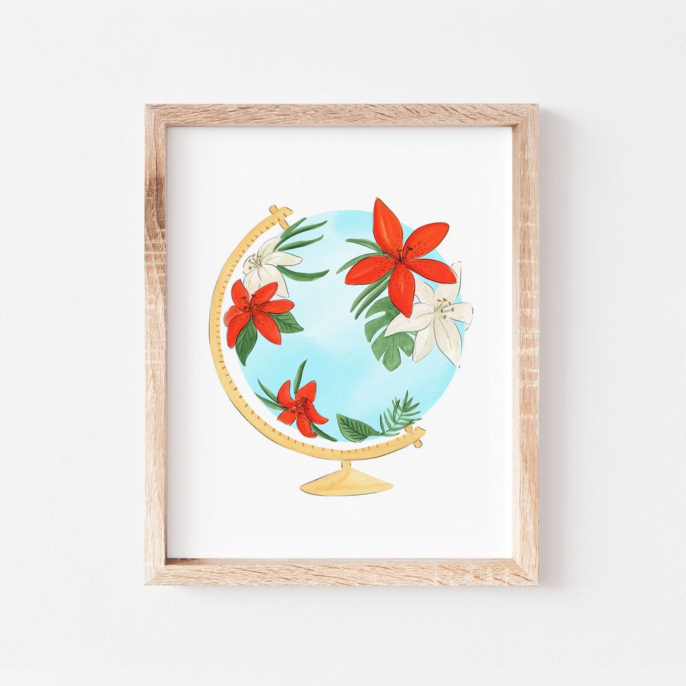 Let the world bloom with beauty with this eye-catching art print! This globe illustration features elegant orange and white lilies surrounded by tropical foliage giving you a fresh and floral flair to any room. Perfect for the green thumb and nature lover alike!