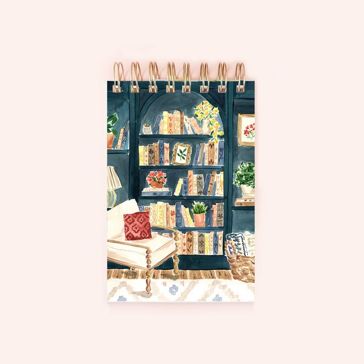 Step into a world of comfort and creativity with this gold wire bound notepad featuring a charming watercolor illustration of a cozy library corner. With deep navy bookshelves, stacks of colorful books, leafy houseplants, and a cushioned armchair, the cover evokes a peaceful space perfect for quiet reflection and imagination.