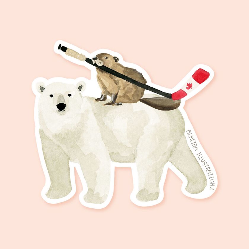 Show off your love for all things Canadian with this adorable Polar Bear & Beaver Hockey Duo sticker! Featuring a charming polar bear buddying up with a cheeky Canadian beaver wielding a hockey stick, this vinyl sticker brings northern spirit and national pride to any surface.